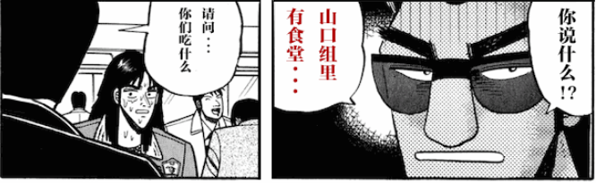 在对山口组成员的采访中了解到,没有食堂以前,虽然组织内部每天分发伙食费,但中午吃饭如果碰上高峰时段,很多店面都没有位子,常常会来不及吃午饭就必须归队……因此,山口组成员激动的表示:“能在食堂吃饭,着实让人感激涕零!”